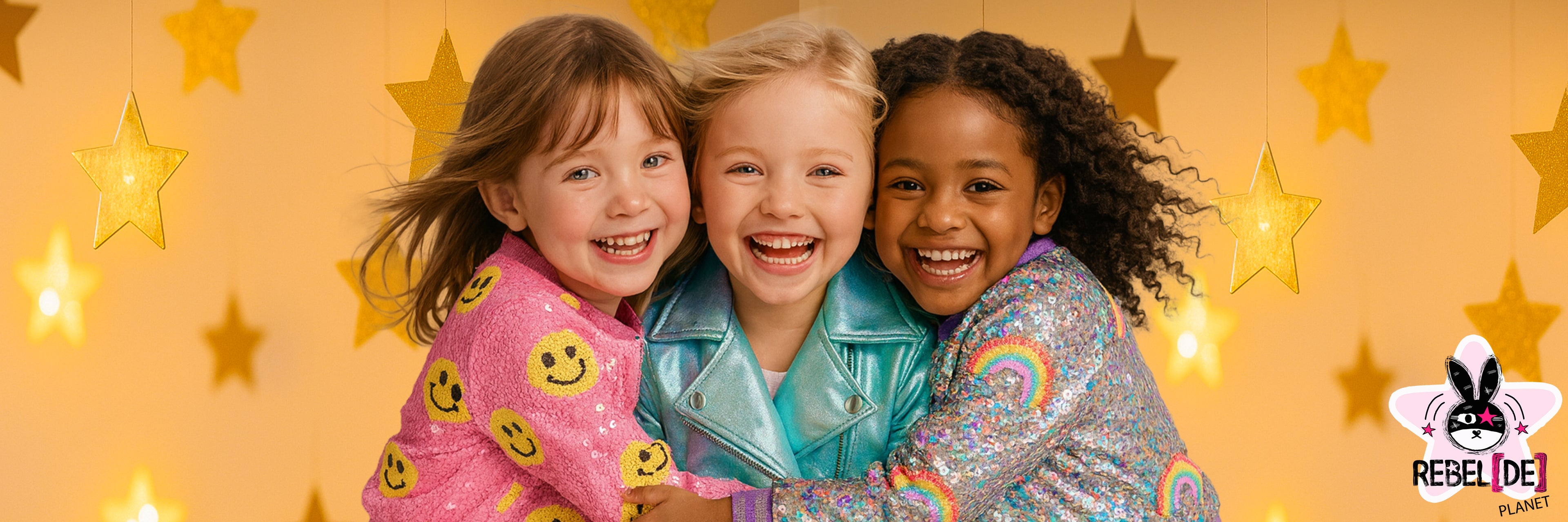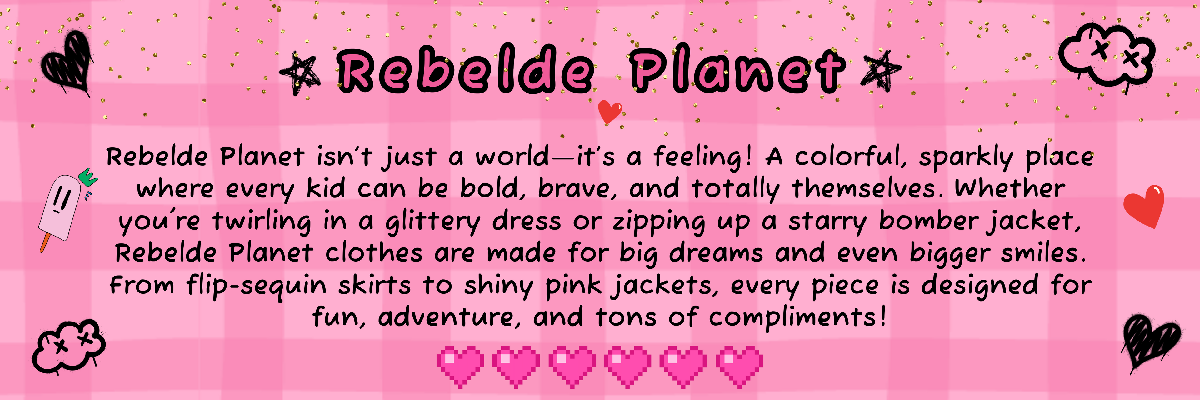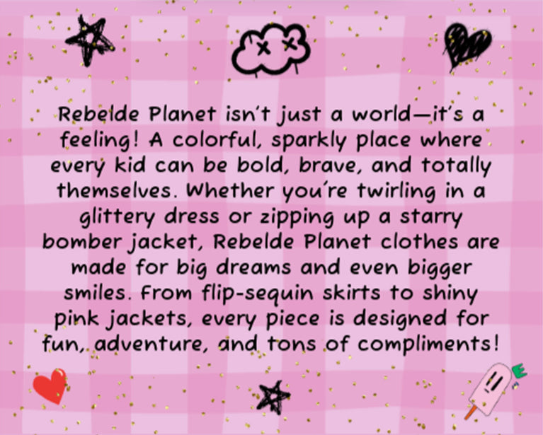 🖤Rebelde Planet🖤 is a fearless, fashion-first label made for kids who want to make a statement. It’s not just about brightly‑colored clothing; it’s about creating confidence, joy, and a sense of identity through what you wear. From flip-sequin bombers to neon sweatshirts and glittering faux-leather jackets, the brand stands out with its unapologetically bold aesthetic and commitment to empowering style.