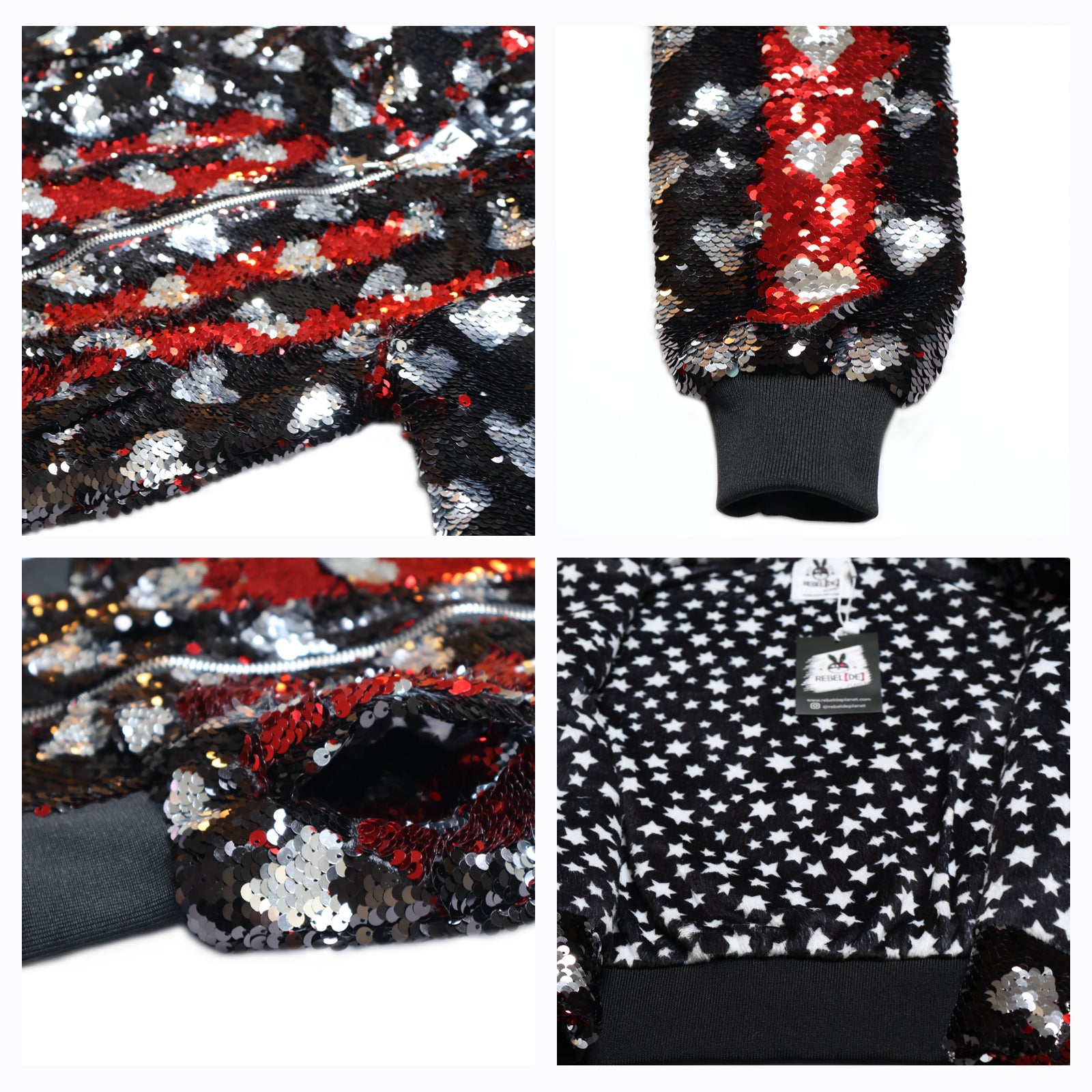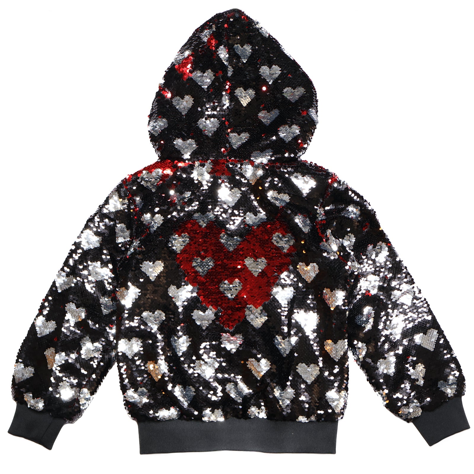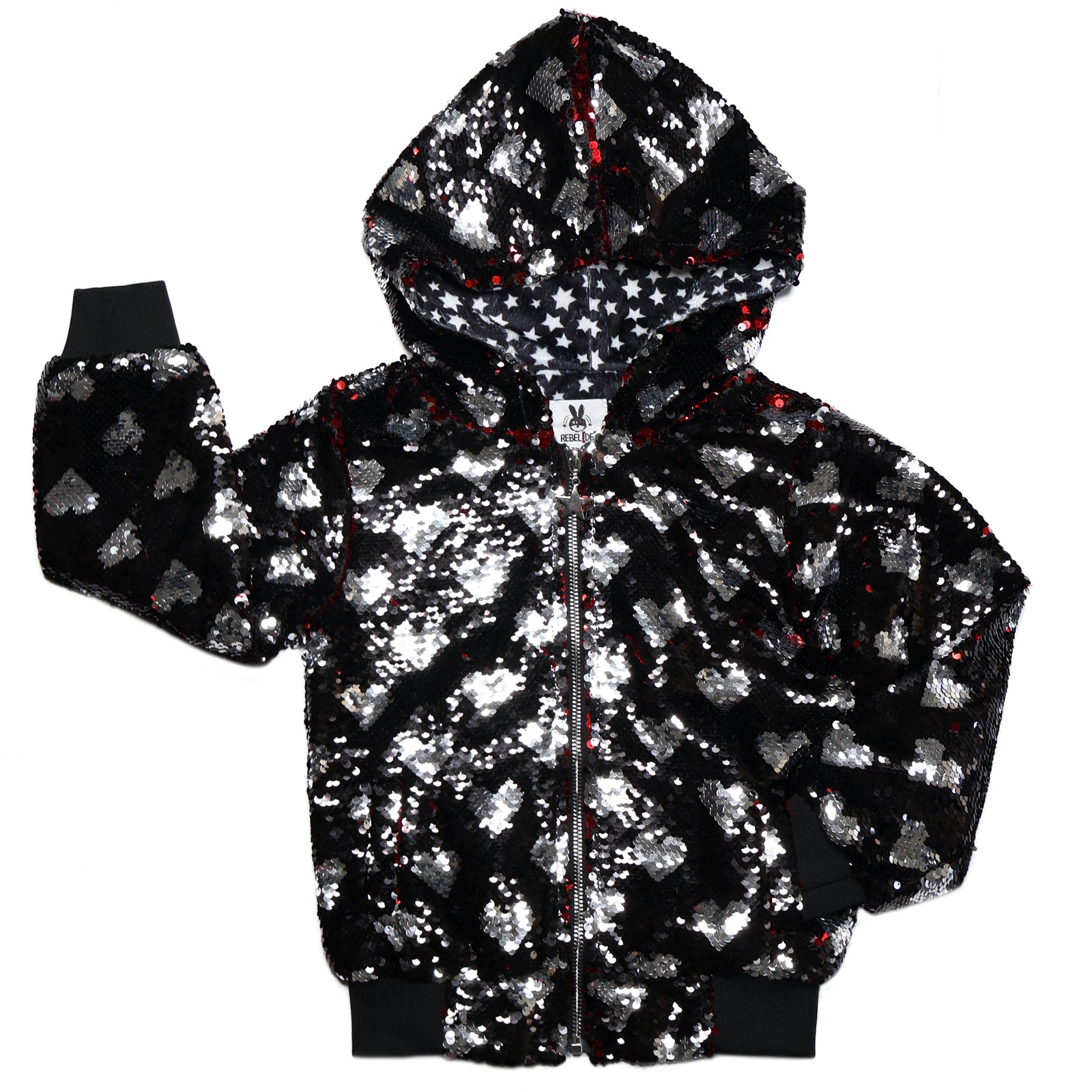 Be a Rock Star with our Awesome hooded sequin Bomber! Black flip sequin with silver hearts, when flipped background turns red ❤️