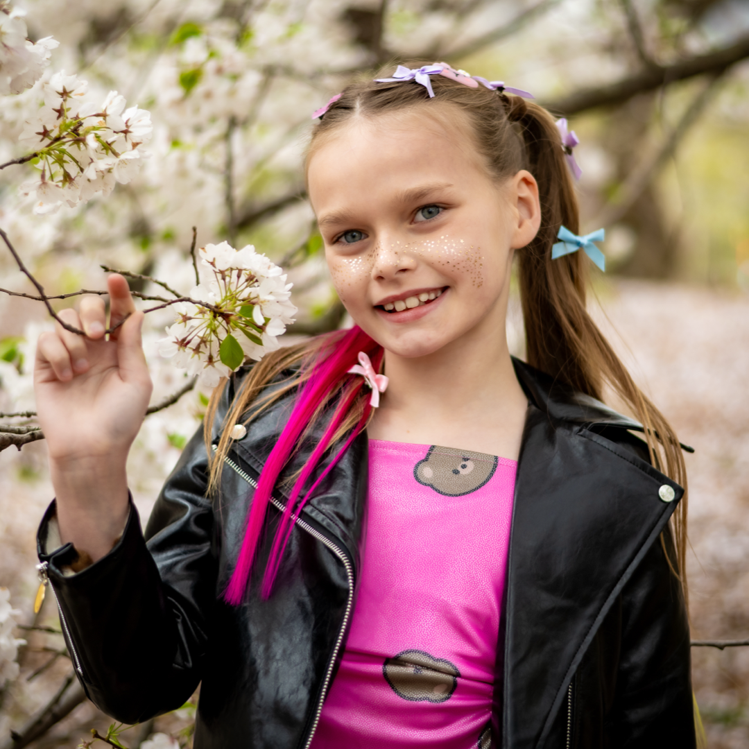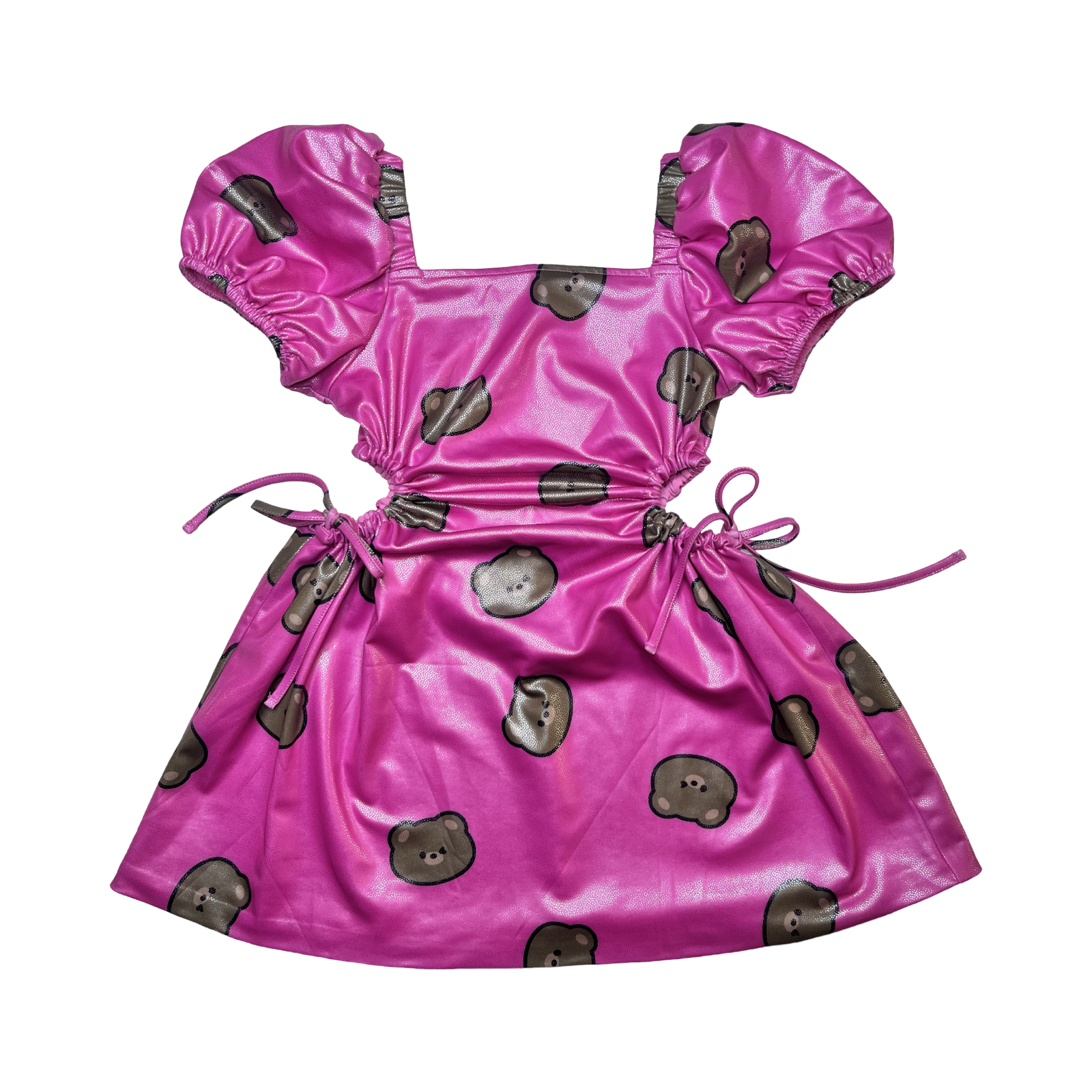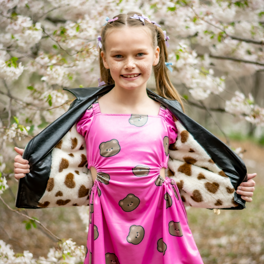 Get ready to twirl into cuteness overload! This bubble-gum pink dress is sprinkled with shiny teddy bear faces that shimmer with every move. Made from magical foil-printed spandex/lycra, it’s stretchy, comfy, and oh-so sparkly—perfect for playdates, parties, or just spreading everyday joy.