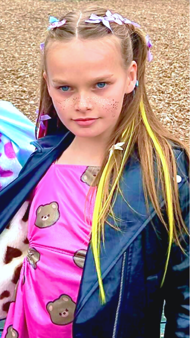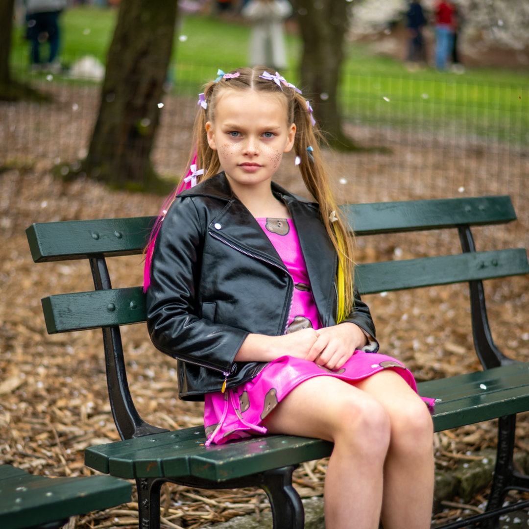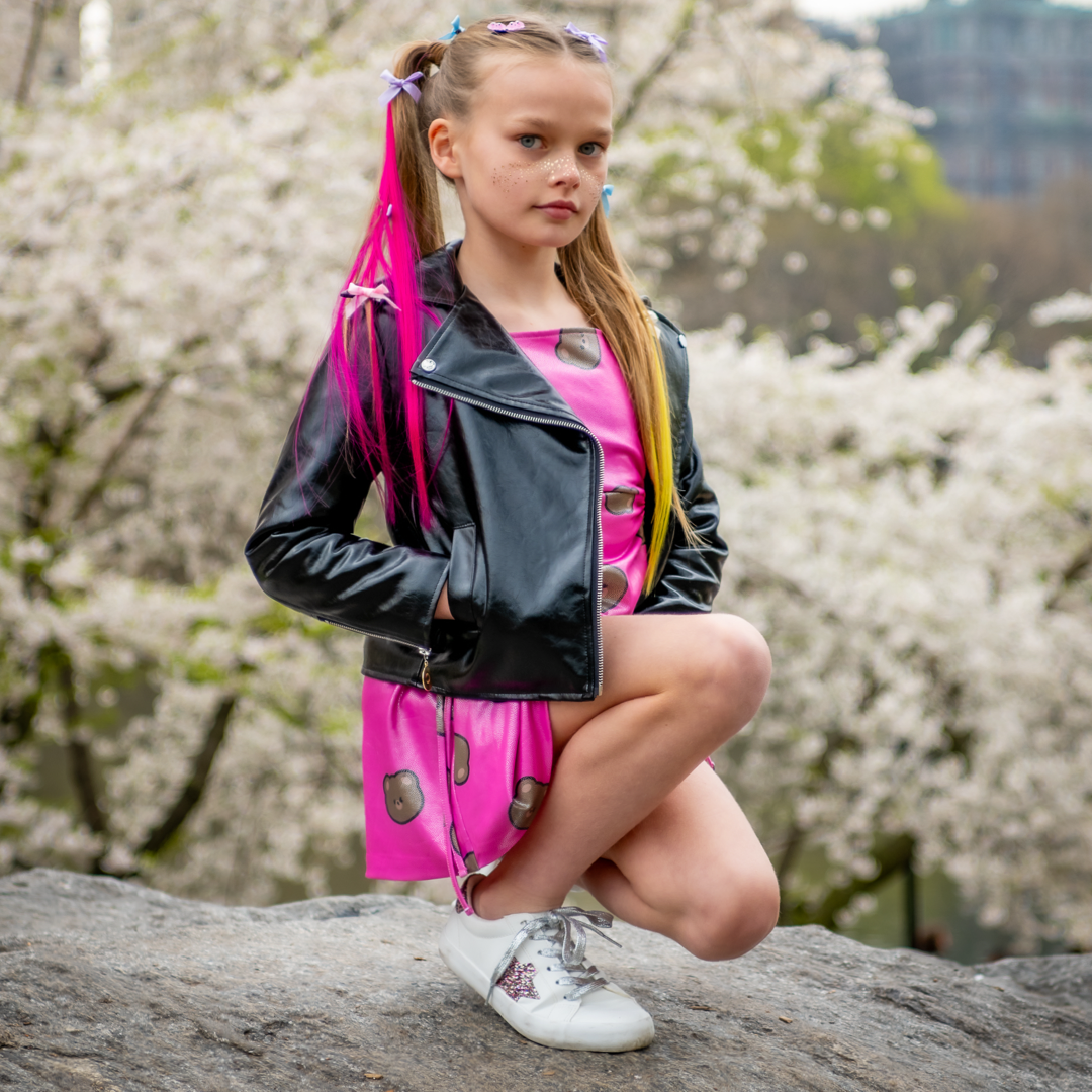 With puffy sleeves, side ties for extra sass, and a glossy finish that catches the light, this dress is a true Rebelde Planet showstopper. Pair it with sparkly sneakers or glittery boots and let your little star shine brighter than ever! 🌈💖