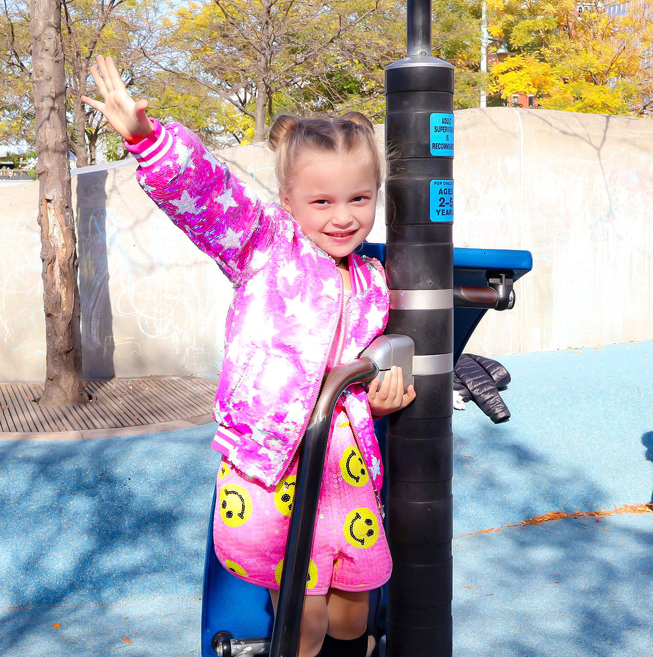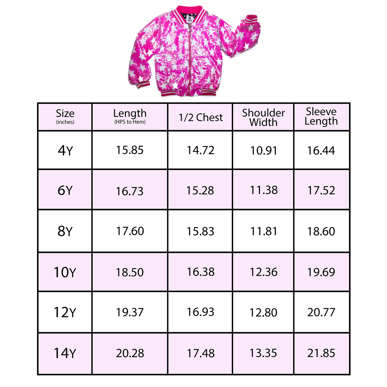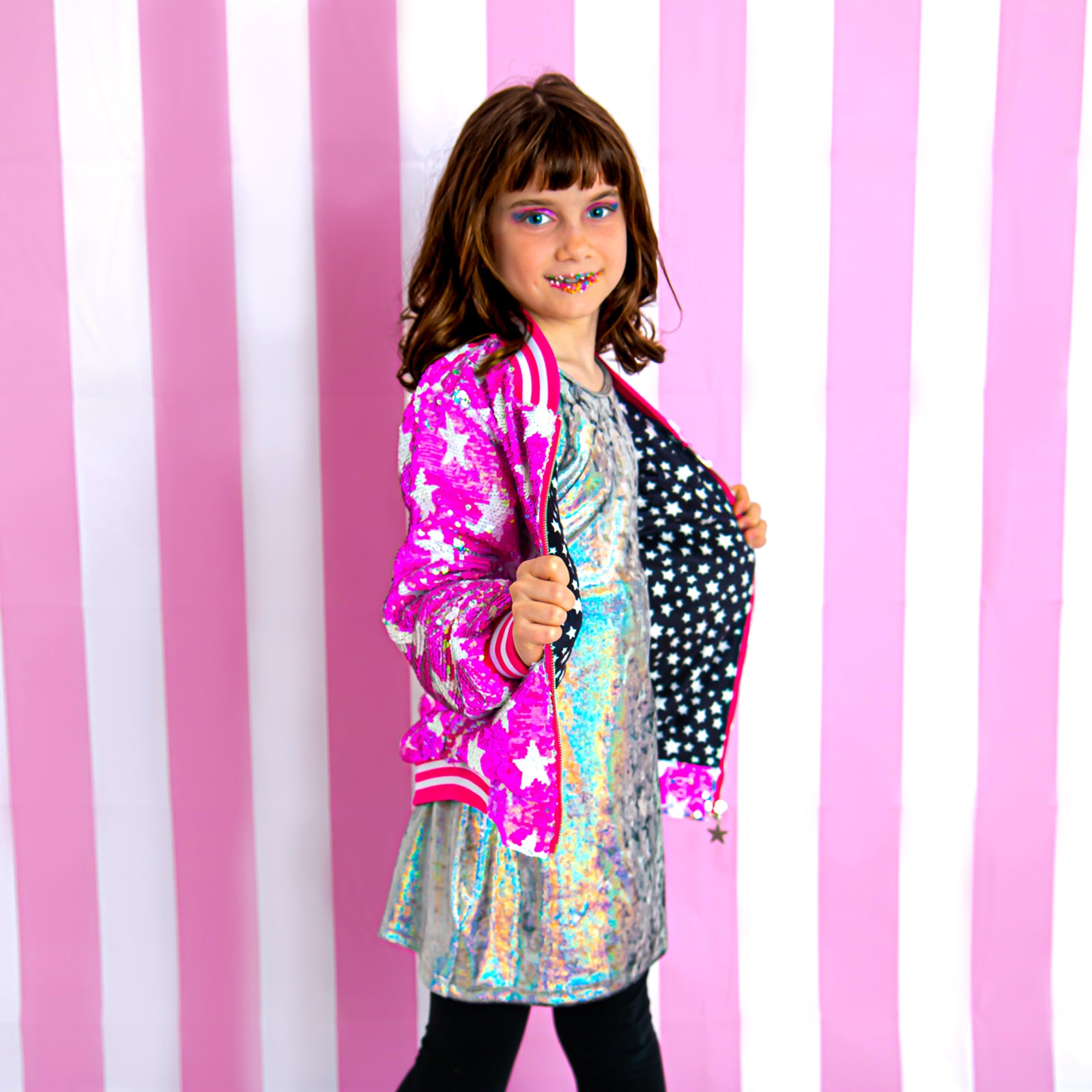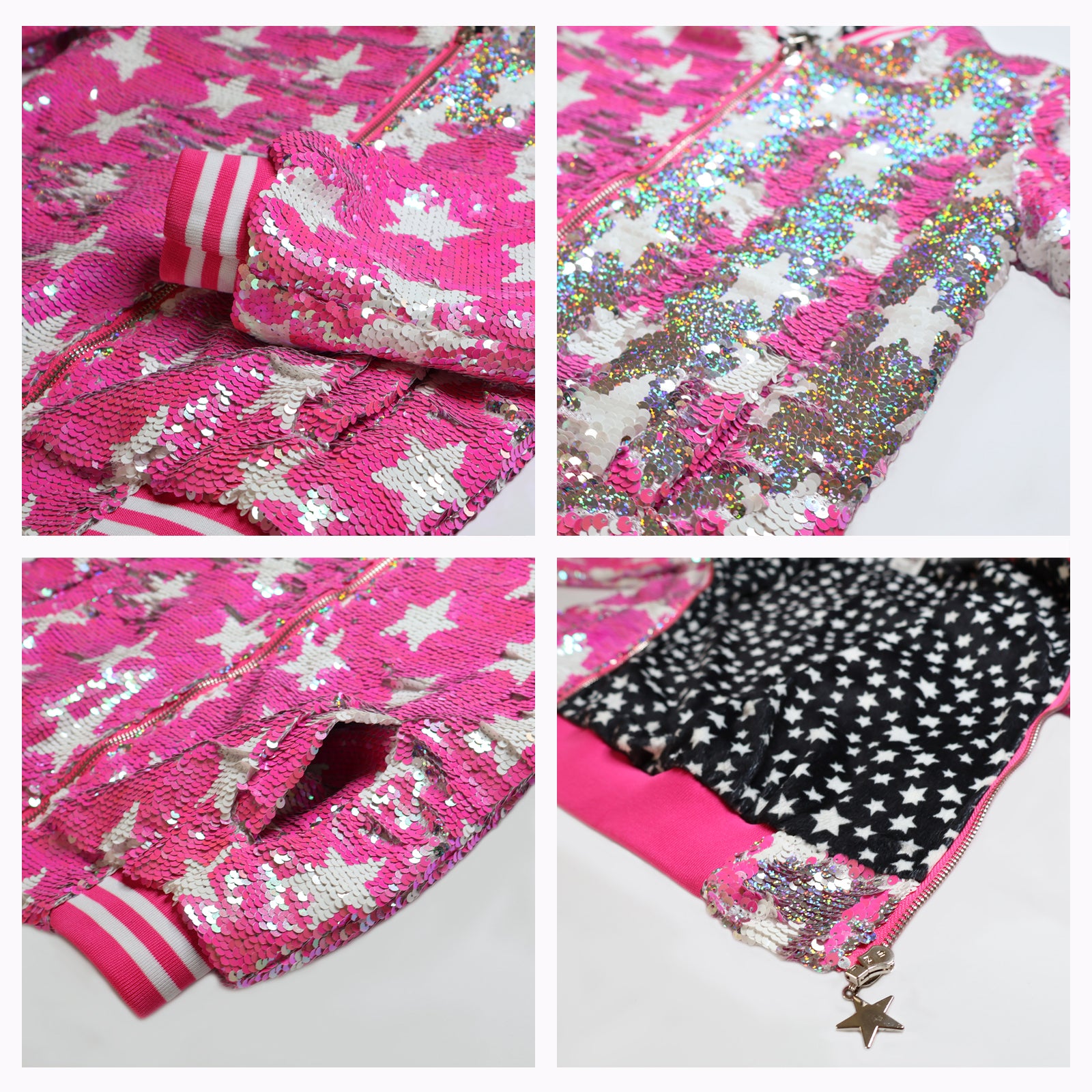 Shine bright with our amazing flip sequin bomber! Hot pink sequin with white stars and side pockets. Striped ribbed elastic on neck, cuffs and waist for better comfort and fit. Silver metallic zipper for an easy slide. Super warm and cozy inner lining.