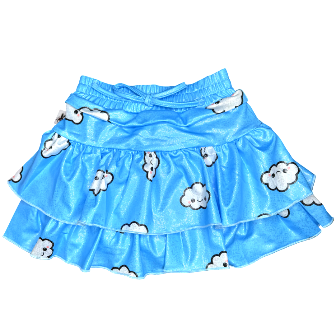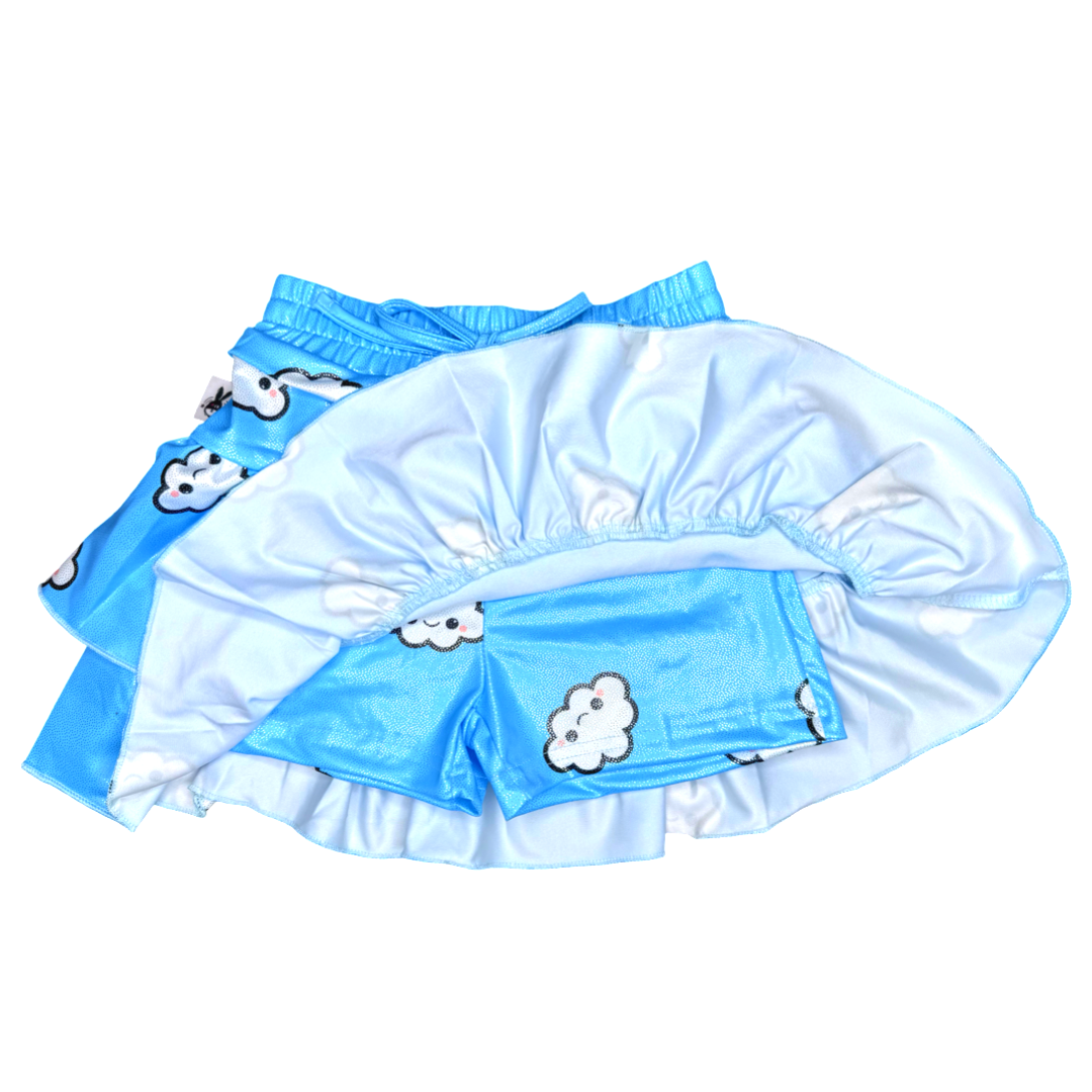 Super cute Kawaii Cloud Double Ruffles Skort in vibrant blue color. Clouds printed all over this spandex/lycra skort. Bicycle shorts under the skirt for a great comfort. Silver dotted foil throughout the fabric giving a shiny metallic look. Perfect skort for a fun party!