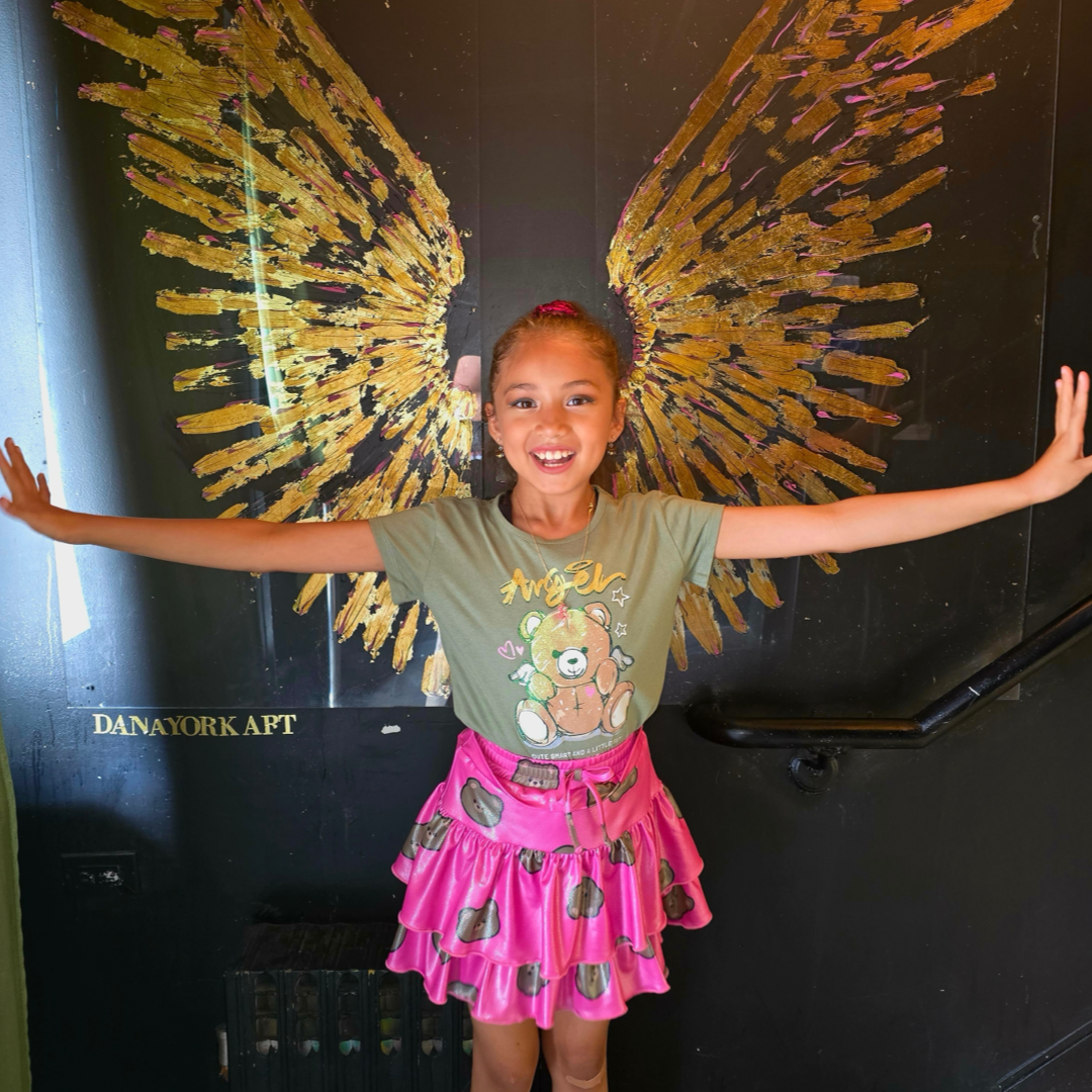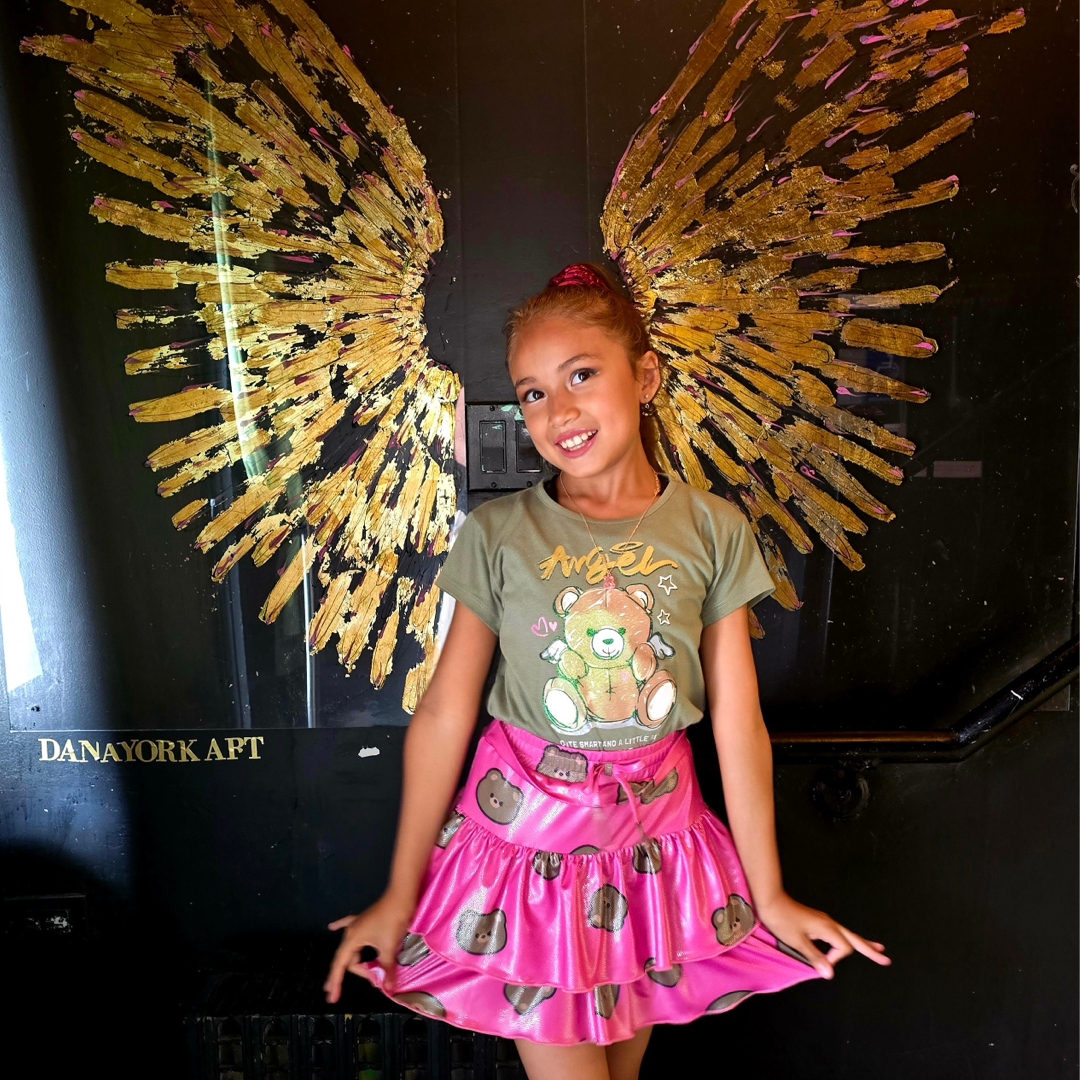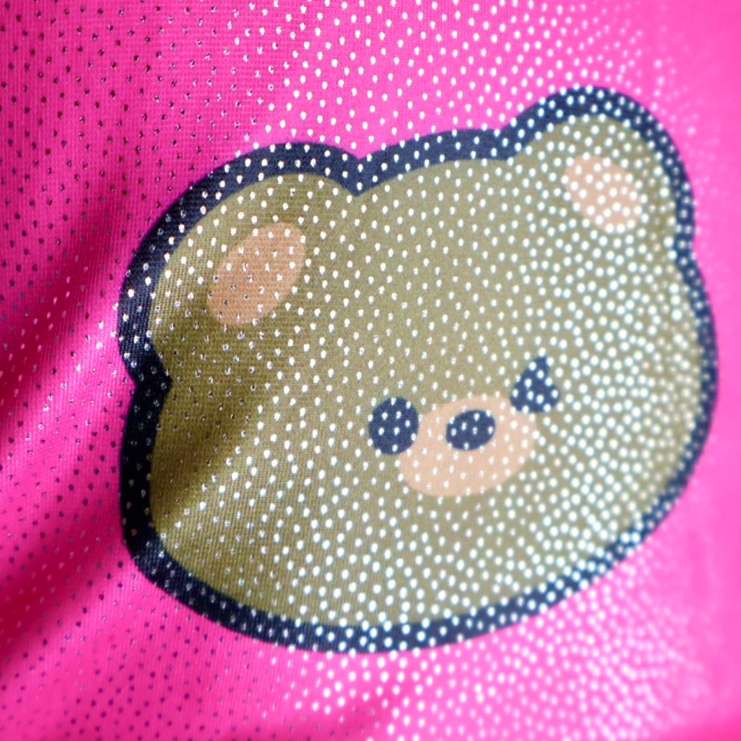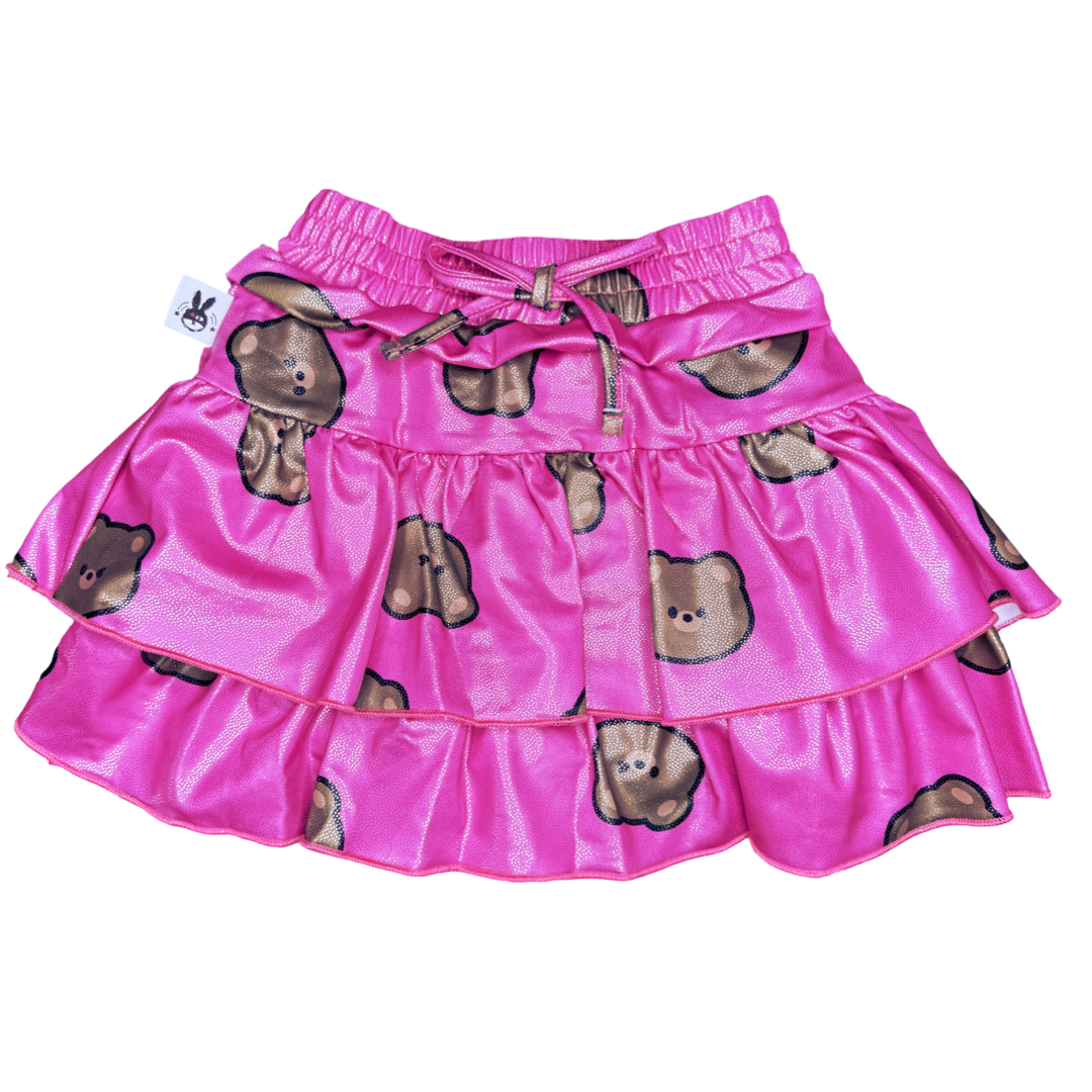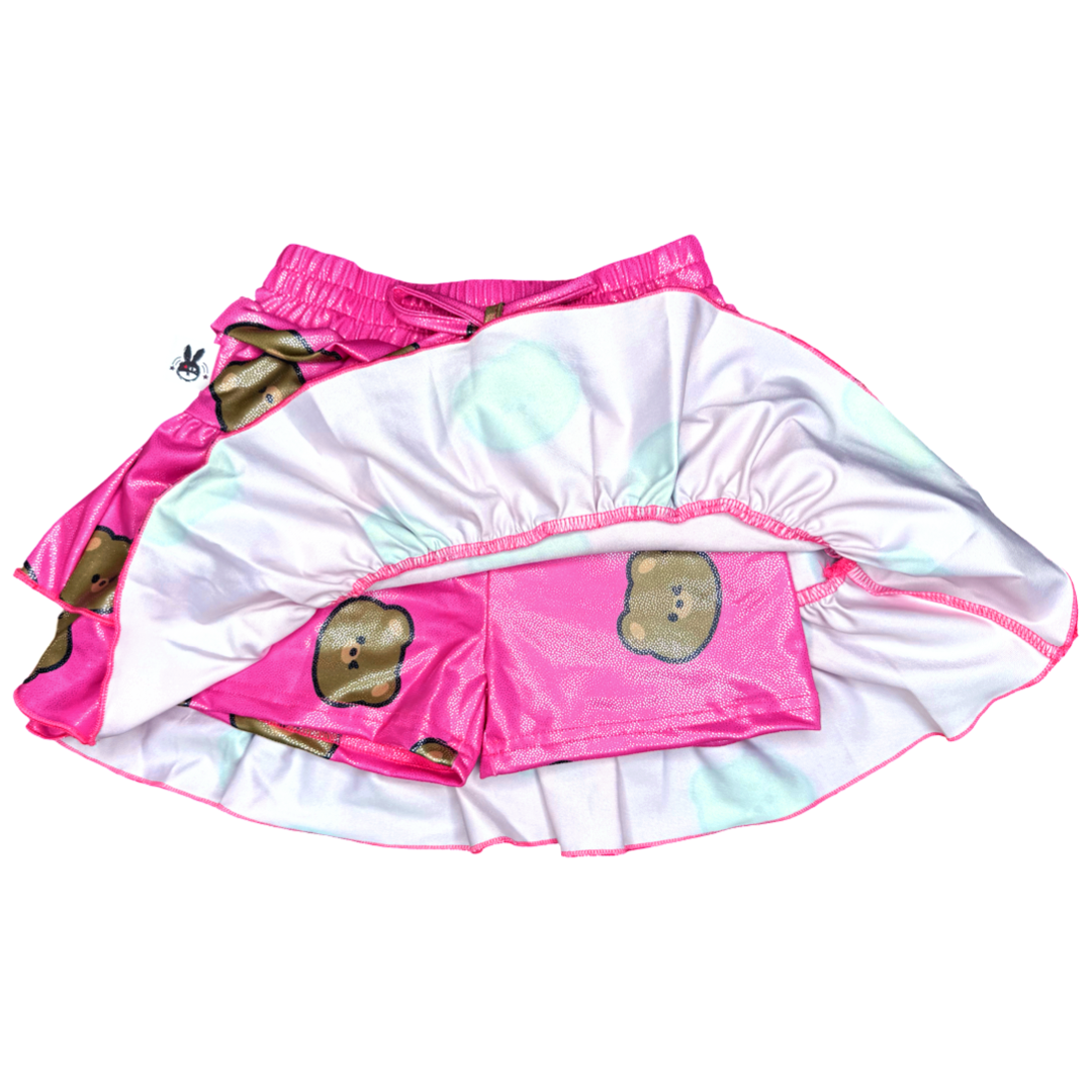 Super cute Kawaii Bear Double Ruffles Skort in vibrant hot pink color. Brown Bears printed all over this spandex/lycra skort. Bicycle shorts under the skirt for a great comfort. Silver dotted foil throughout the fabric giving a shiny metallic look. Perfect skort for a fun party!