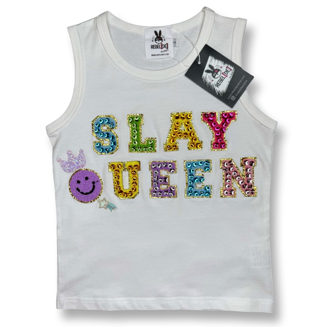 Slay the day with our super trendy tank top “Slay Queen.” Colorful patch letter decorated with gems for an amazing sparkly look!